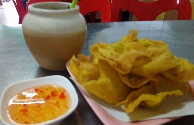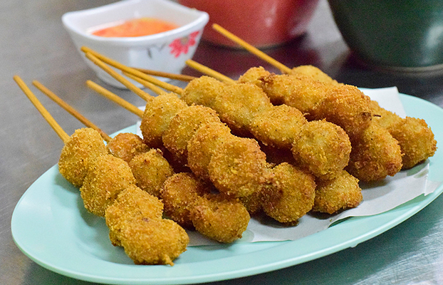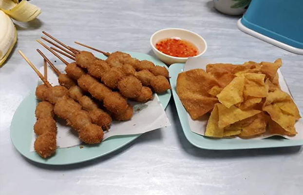 นอกจากไอติม ร้านยังขายลูกชิ้นปลาดทอดด้วย ไม้ละ 3 บาทเท่านั้นเอง ลูกชิ้นปลาทอดกรอบนอกนุ่มในทานกับน้ำจ