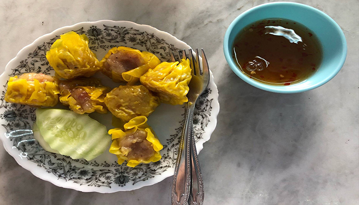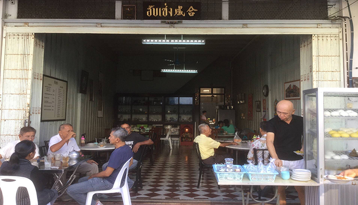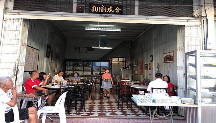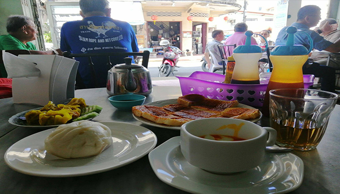 เปิดขายอาหารเช้ากาแฟ มาตั้งแต่ 90 ปีที่แล้วร้านนี้อยู่ติดกับร้านข้าวต้มเกาะไทยเลยครับ ที่ร้านขายดีมากมีลูกค้ามาทานทุกเช้า จำหน่ายทั้งชุดอาหารเช้า ไส้กรอก หมูทอด ปลาทอดขนมปังปิ้งทาสังขยา กาแฟน้ำชา บ๊ะจ่างและขนมจีบ