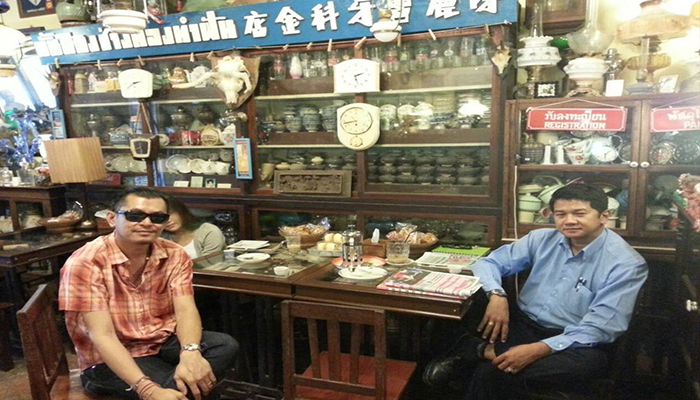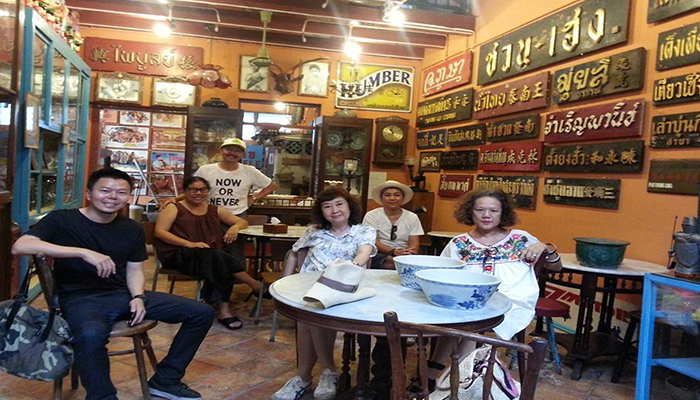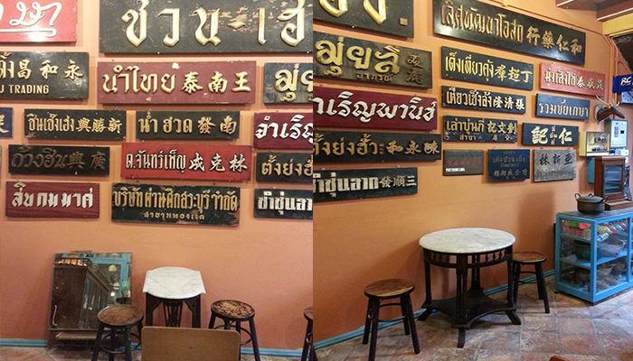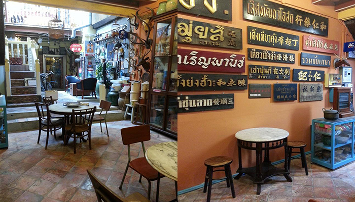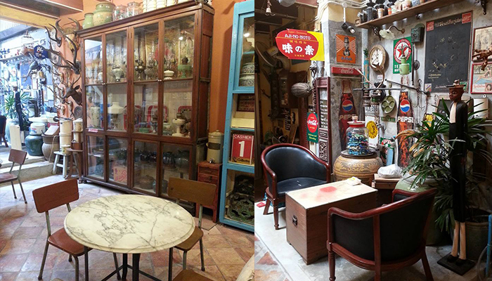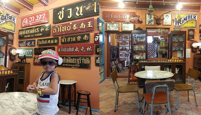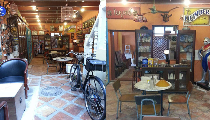 ร้านเป็นห้องแถวเล็กๆเปิดเข้ามาข้างในแอร์เย็นฉ่ำเลยทีเดียว มีที่นั่งประมาณ 4-5 โต๊ะ และของเก่าของโบราณตกแต่งร้านอีกเพียบ มองซ้ายขวาหน้าหลังบนหัวก็อัดแน่นไปด้วยของเก่าดูวินเทจมากๆค่ะ เครื่องดื่มที่นี่ก็จะมีทั้งกาแฟสดและกาแฟโบราณรสชาติใช้ได้เลยนะ