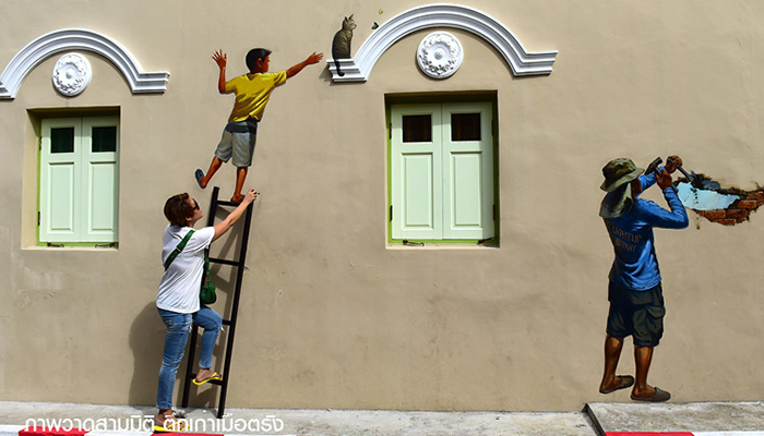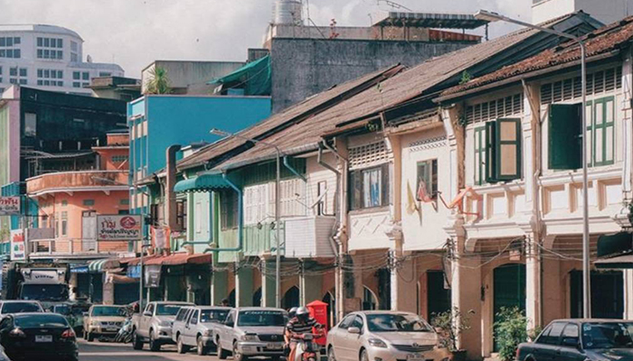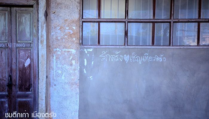 ตั้งอยู่กระจายลัดเลาะเรื่อยๆ ในตัวเมืองตรัง ตามถนน ถ. ราชดำเนิน ถ. กันตัง และ ถ. พระรามหก จะพบ เห็นตึกเก่าซ่อนตัวอยู่เป็นระยะลักษณะของตึกจะเป็นตึกในรูปแบบชิโนโปรตุกิสคล้ายกับเมืองภูเก็ต ตึกเก่ากระจายอยู่ทั่วไปทั้ง ในย่านตลาดสด และย่านการค้าใกล้กับสถานีรถไฟ หอนาฬิกาตรัง ซึ่งสามารถเดินชมเมืองได้แต่เช้าโดยเริ่มจากโปรแกรมอาหารพื้นเมืองของตรังที่ขึ้น เช่น ติ่มซำ ขนมจีบ ซาลาเปา ฮะเก๋า ปาท่องโก๋ ฯลฯ กับกาแฟ ชาร้อน หรือจะเป็นหมูย่างกับกาแฟร้อนเป็นมื้อเช้าอย่างคนตรังขนานแท้นอกจากชมตึกเก่าแล้ว บริเวณถนนราชดำเนิน สี่แยกท่ากลาง ภาพวาด 3 มิติบนฝาผนังตึกเก่าทรงชิโนโปรตุกีต จังหวัดตรัง ซึ่งทางสโมสรโรตารี่ตรังจัดทำขึ้นเพื่อส่งเสริมการท่องเที่ยว และฉลองครบรอบ 100 ปี เมืองทับเที่ยง โดยมีศิลปินแห่งเมืองตรังได้มา สรรค์สร้าง และ แต่งแต้มสีบนกำแพงของตึกเก่าเมืองตรัง วาดภาพรูปสัญลักษณ์เมืองตรัง เช่น ถ้ำมรกต และต้นศรีตรัง สัญลักษณ์ ของเมืองตรังซึ่งนักท่องเที่ยวรู้จักกันดี นักท่องเที่ยวสามารถมาถ่ายรูปโพสต์ท่าสุดเก๋ กับรูปวาดสามมิติบนผนังตึกชิโนโปรตุกีส ไว้เป็นที่ระลึก