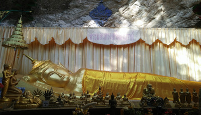 ตรังเองก็มี “วัดภูเขาทอง” เช่นกัน แต่สิ่งที่แตกต่างสำหรับวัดภูเขาทองที่ จ.ตรัง ที่ถือว่าเป็นเอกลักษณ์โดดเด่นที่สำคัญ นั่นก็คือพระพุทธรูปทรงเทริดมโนราห์ และมีพระอุโบสถที่งดงามเป็นอย่างยิ่ง ที่สร้างขึ้นโดยใช้กระจกเงาล้อมรอบ อีกทั้งยังมีการจำลึกเรื่องราวตำนานต่างๆ ที่เกี่ยวข้องกับพระพุทธศาสนาลงบนหินต่างๆ นับว่าเป็นวัดคู่บ้านคู่เมือง ที่ชาวตรังให้ความเคารพเลื่อมใส และมีความสวยงามเป็นอย่างยิ่ง วัดภูเขาทอง สร้างอุโบสถวิหาร ราว พ.ศ.1493 มีการสร้างพระพุทธไสยาสน์ขึ้นโดยพระนางเลือดขาว ชายาของเจ้าเมืองพัทลุง องค์พระมีความยาว 9 หลา หันพระพักตร์ไปทางทิศตะวันออก มีการนำทรัพย์สินที่ตั้งใจจะเอาไปร่วมบูรณะแต่ไปเข้าร่วมไม่ทัน จึงเก็บไว้ในถ้ำ และสร้างพระพุทธไสยาสน์สวมเทริดหรือชฎาของมโนราห์ครอบพระเศียรไว้ที่ปากถ้ำ ต่อมาทรัพย์สินถูกขโมย เหลือไว้แต่องค์พระพุทธไสยาสน์ ซึ่งเป็นดินได้ชำรุดทรุดโทรม ภายหลังมีการบูรณะด้วยการโบกปูนปั้นและทาสีเป็นสีทองทั้งองค์
