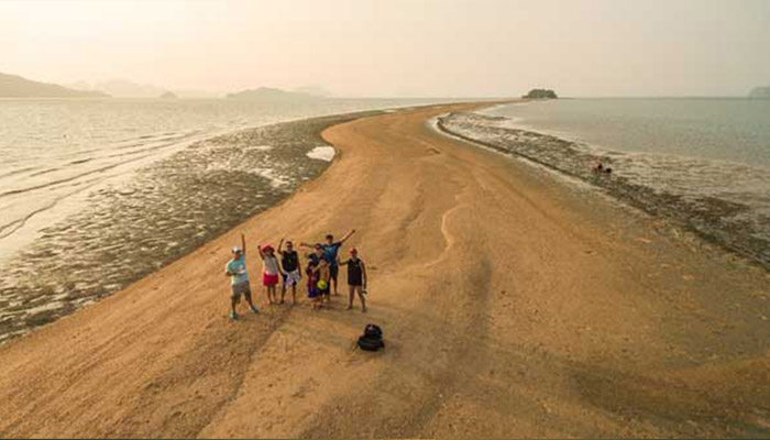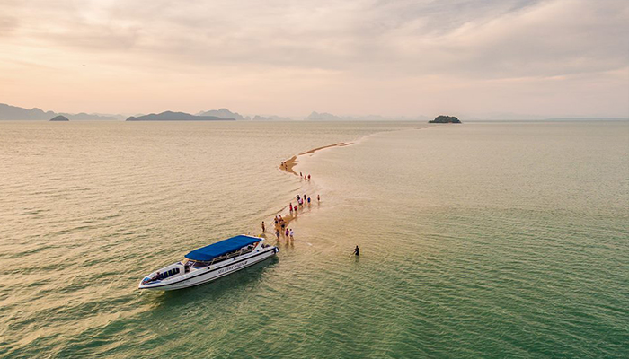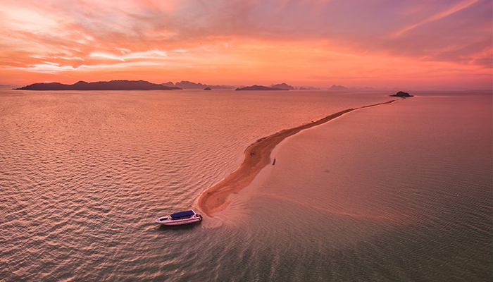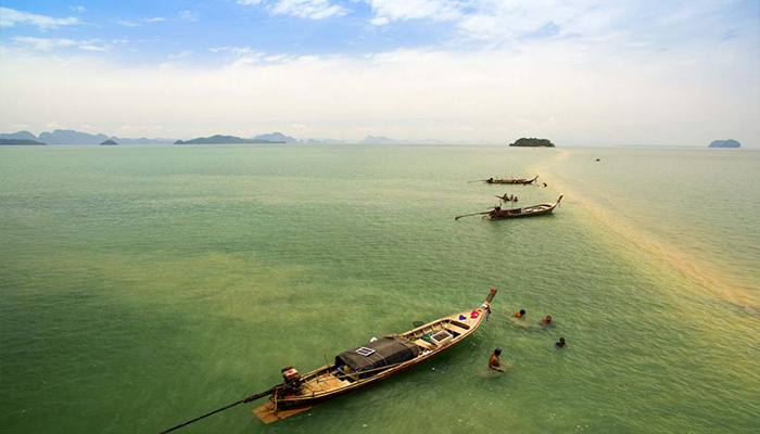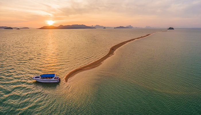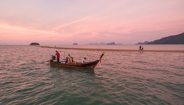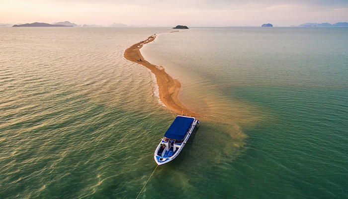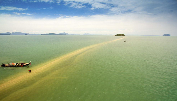 ด้วยความสวยงามแปลกตาในช่วงน้ำลดตลอดความยาวคดเคี้ยวกว่า 2 กิโลเมตร จุดแห่งนี้ อยู่ห่างจากเกาะยาวน้อย ประมาณ 3 กิโลเมตร เป็นดั่งสาวน้อยบริสุทธิ์สดใส นอนเปลือยเผยโฉมความงาม ทอดกายเป็นแนวยาว กลางผืนน้ำทะเล สีเขียวคราม ห้อมล้อมด้วยสายตาของหมู่เกาะใหญ่น้อย ที่คอยระแวดระวังภัย มิให้ใครมาปองร้ายเธอ จนกลายเป็นจุดท่องเที่ยวที่น่าสนใจอีกแห่งหนึ่ง เป็นสวรรค์ของนักถ่ายภาพ ทำให้ได้รับกระแสการตอบรับจากนักท่องเที่ยว ที่ต่างมุ่งหน้ามาสัมผัสจากภาพทะเลแหวกนี้ วัดระยะทาง จากหัวเกาะ จนถึง ปลายสันดอนทราย วัดได้ประมาณ 2 กม. สำหรับช่วงเวลาที่เหมาะสม ต้องไปรอดูตั้งแต่น้ำยังไม่ลง นั่นก็คือช่วงที่ยังไม่เกิดสันดอนทราย พอน้ำลงเท่านั้นแหละ (ระดับน้ำประมาณ 1.5เมตร) สันดอนแรกที่จุดปลายสุดจะปรากฎออกมาให้เห็น มันจะเป็นภาพที่ มหัศจรรย์เป็นอย่างมาก เมื่อได้ลงไปยืน ณ จุดนั้น เดินมุ่งหน้าย่ำลงผืนทรายที่ผสมด้วยเศษเปลือกหอยไปยังจุดหมายปลายทางที่ตัวเกาะพลอง ขณะที่น้ำกำลังลดเรื่อยๆ ช่างเป็นบรรยากาศที่ มหัศจรรย์แบบสุดๆ ระหว่างทางจะพบเห็นวิถีชีวิตของชาวบ้านที่มาหาหอยแถวนั้นด้วย