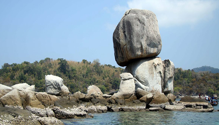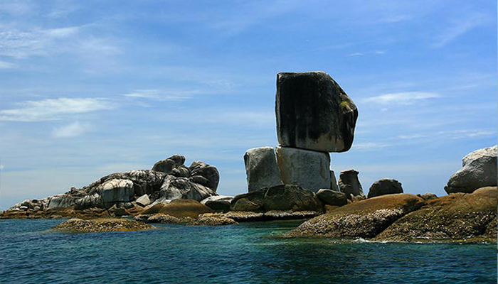 ตั้งอยู่ด้านหน้าเกาะดง ตรงเกาะผึ้ง ห่างจากเกาะอาดัง-ราวีราว 15 กิโลเมตร จุดเด่นแปลกตากว่าที่อื่นใด ธรรมชาติสร้างสรรค์ให้หินก้อนใหญ่รูปทรงสี่เหลียมสองก้อนวางซ้อนทับกัน ก้อนล่างนั้นแตกแยกเป็น 2 ซีก ก้อนบนเอียงดูท่าว่าจะหล่นแหล่ แต่ก็ไม่หล่นสักที ความงดงามของทะเลแถบถิ่นนี้ อยูที่โลกใต้ท้องน้ำ บริเวณรอบเกาะหินซ้อน มีแนวปะการังที่สวยงาม มีทั้งปะการังแข็ง ปะการังอ่อนดูเป็นลอนเป็นคลื่นปกคลุมท้องน้ำกว้างไกล ปลาสวยงามน้อยใหญ่หลายสายพันธ์ อย่างปลาการ์ตูนนั้นชอบว่ายวนเวียนซ่อนตัวตามแนวปะการัง และดอกไม้ทะเล ระบบนิเวศน์ใต้ท้องทะเลแถบนี้ที่ยังความอุดมสมบูรณ์อีกแหล่ง